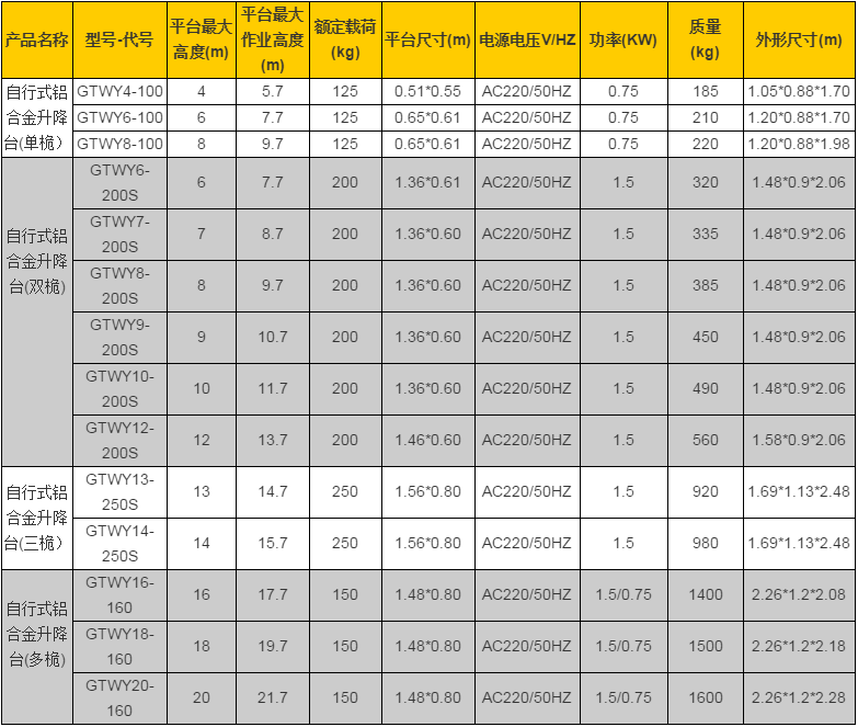 自行式鋁合金升降平臺技術參數(shù):